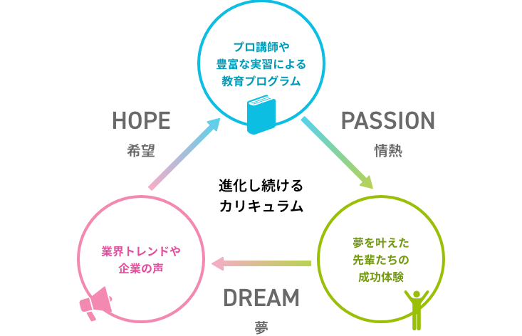 ヒューマンアカデミーのカリキュラムは”学生の夢”を実現する力をしっかりと身につけるけるため、常に新しい技術を取り入れたカリキュラムを導入。業界が求める人材・技術の変化のスピードに対応する教育をおこなっています。