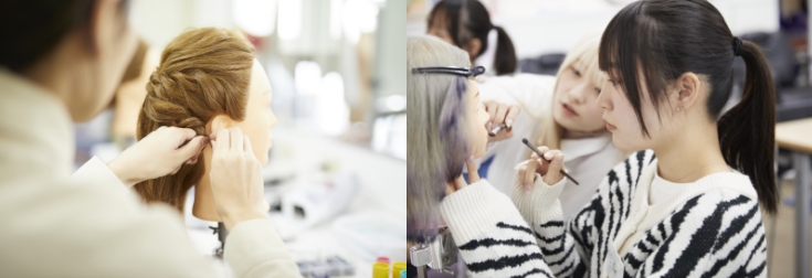 ヘアメイク技法Ⅰ・Ⅱプロカメラマンによる撮影実習や外部ヘアメイクコンテスト優勝に向けて技術を磨き、より売り英ティブでモードな世界案を養いつつ、様々は人へのヘアメイクの提供ができる技術を習得します。