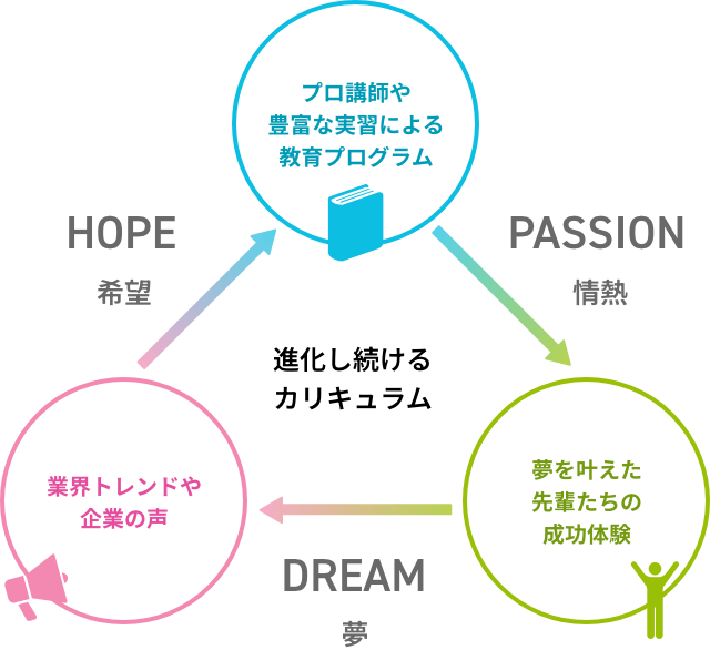 ヒューマンアカデミーのカリキュラムは”学生の夢”を実現する力をしっかりと身につけるけるため、常に新しい技術を取り入れたカリキュラムを導入。業界が求める人材・技術の変化のスピードに対応する教育をおこなっています。