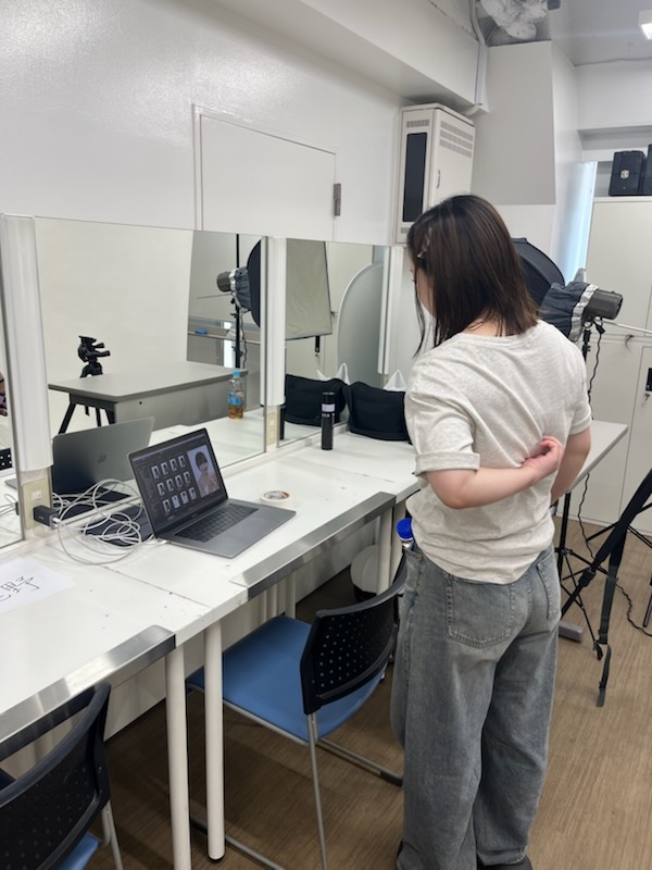 笑色んな表情をヘアメイクをした学生が指示を出しながら