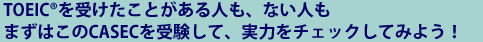 CASEC(Computerized Assessment System for English Communication)は、英検(財団法人日本英語検定協会)が基礎開発し、現在、旺文社グループの株式会社教育測定研究所が開発・運営しているインターネット上で受験できる英語コミュニケーション能力判定テストです。個人の能力に合わせてテスト問題を変化させていく適応型のテストシステムなので、従来のペーパーテストに比べて短時間(約30〜40分)で、正確な測定が可能です。