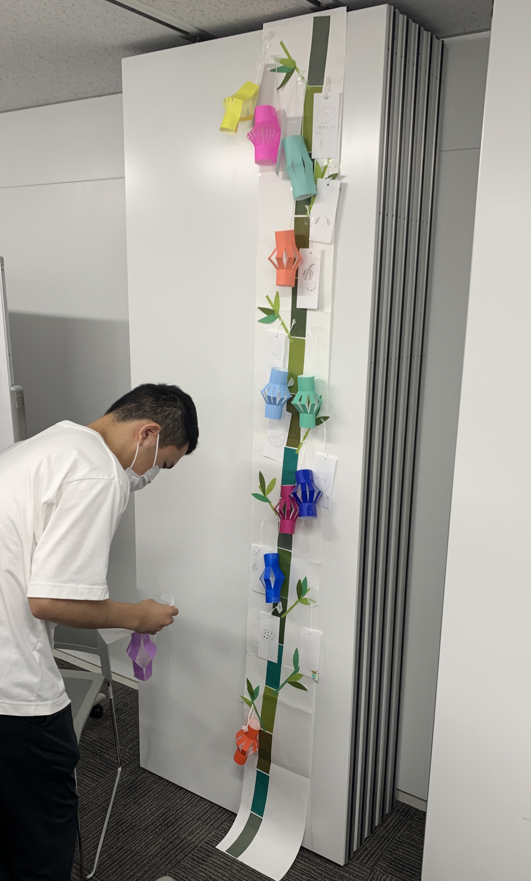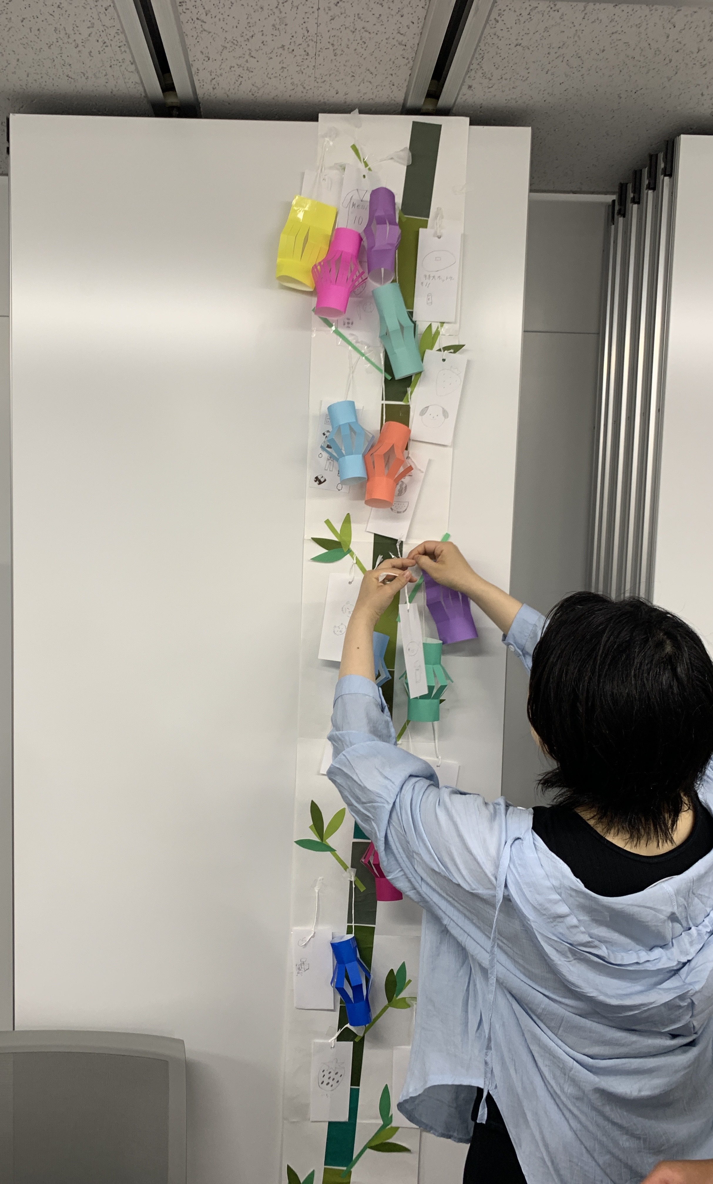 次に、折り紙で楽しむ七夕飾り提灯を制作して飾りました。