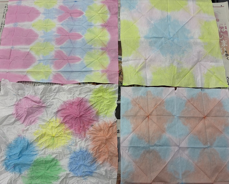 石井先生 :紙を折りたたんで絵の具を染み込ませ、いろんな模様をつくりだす遊びなんですよ。今回は障子紙をつかってます。折り方を変えることで模様が無限に広がってきますね。