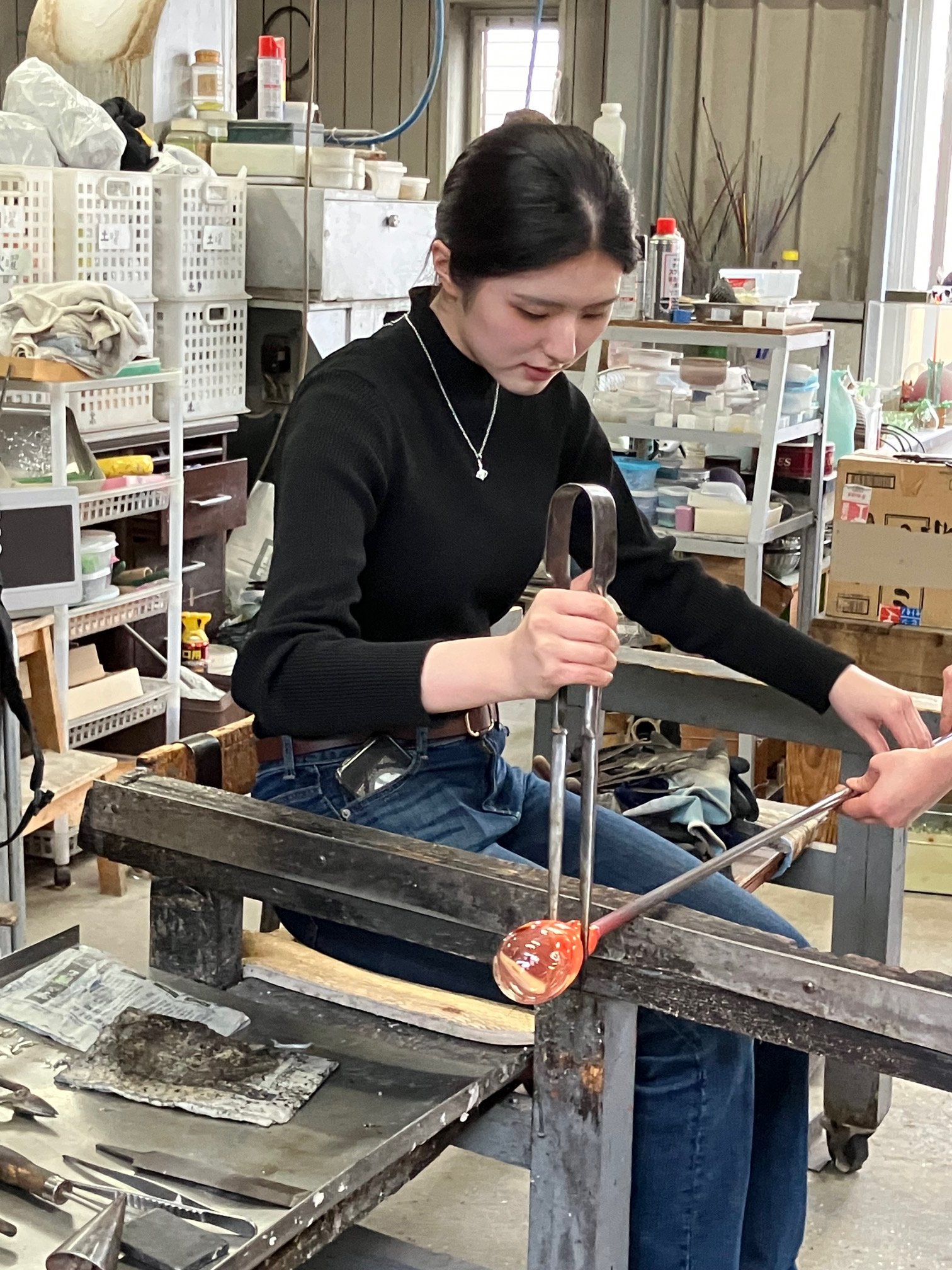 吹きガラス体験では、熱したガラスの扱いに苦戦しながらも、講師の方のサポートを受けながら世界に一つだけの作品を制作。