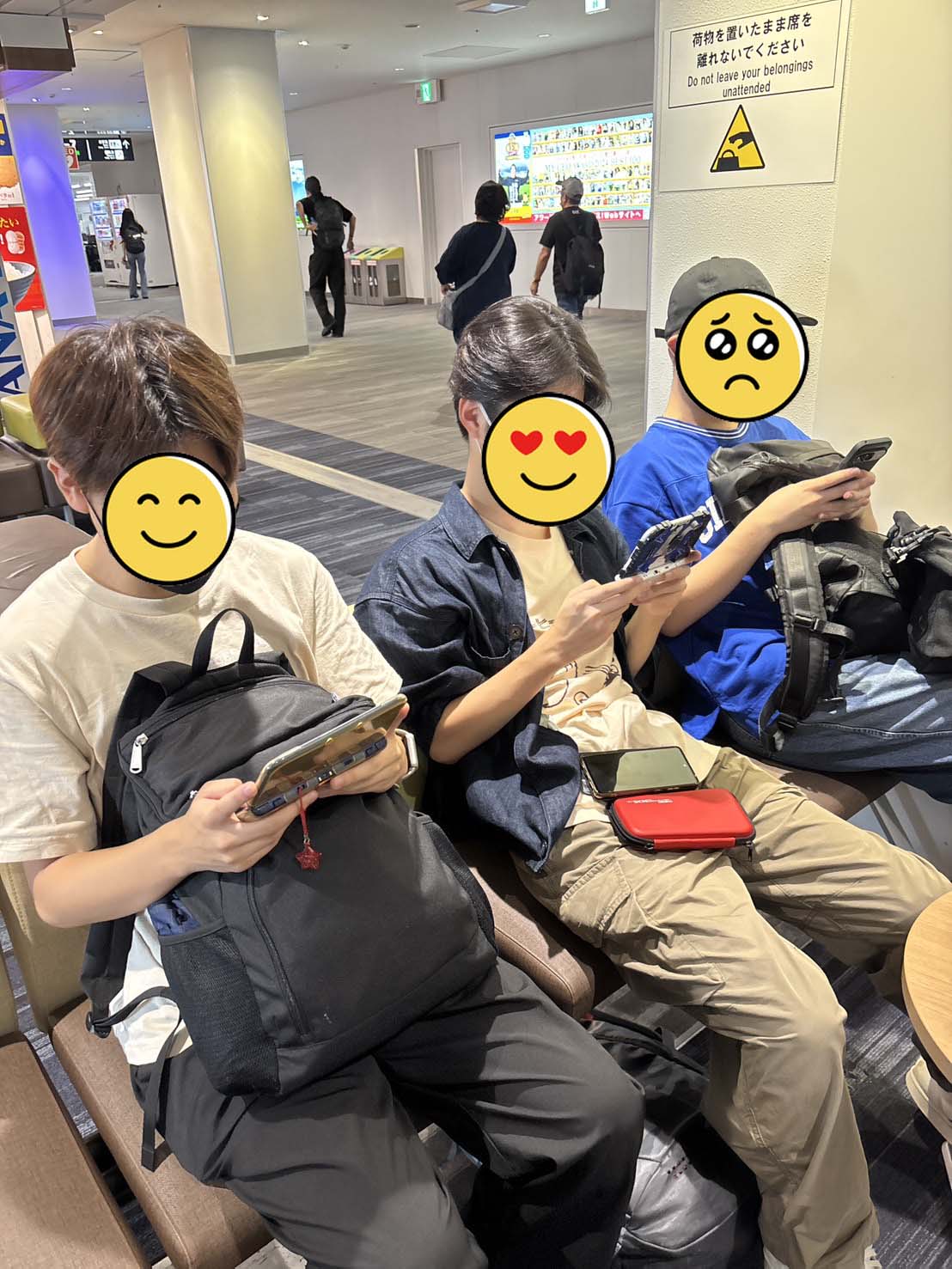 出発前の福岡空港待機中から持参したゲームに没頭する学生たち・・・