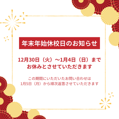12/30(火)~1/4(日)は年末年始の休校期間となります!休校期間中にいただいたLINEにつきましては、1/5(月)以降、順次ご返信させていただきます!なお上記期間中でも資料請求やオープンキャンパ…