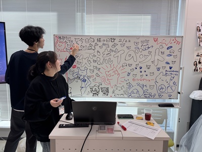 こんにちは!京都校です!先日、高校生の皆さんと京都校の在校生で交流会をしました!この日は【2月22日】ネコの日ということで在校生のみんなが猫のイラストを沢山描いてお出迎え!猫ちゃんでいっぱい!笑在校生…
