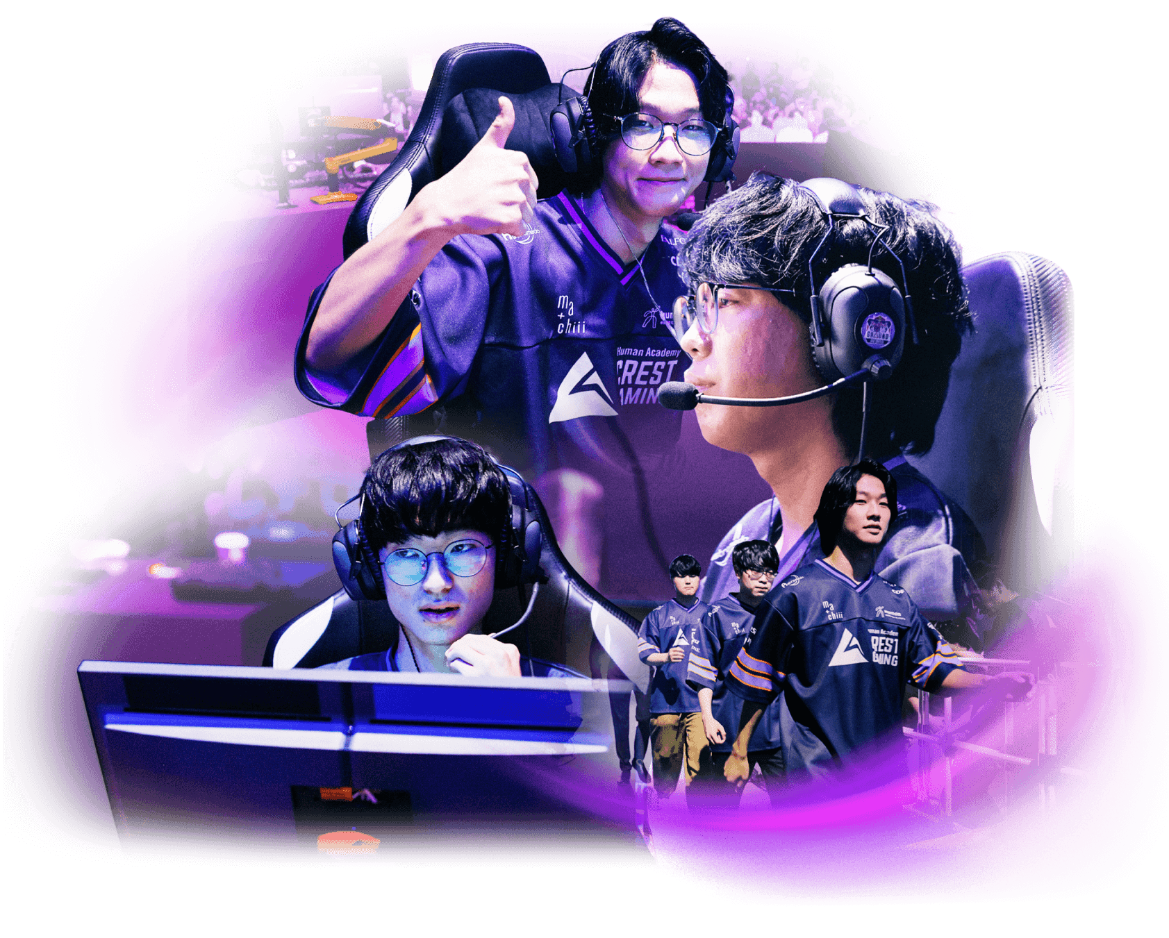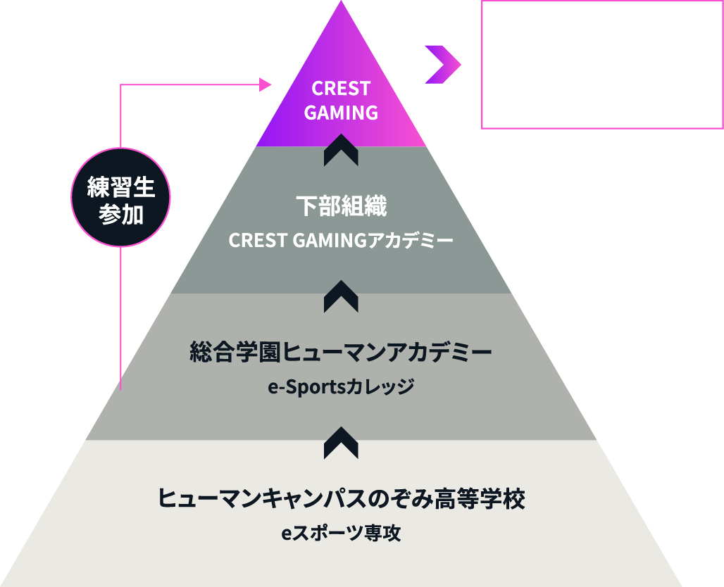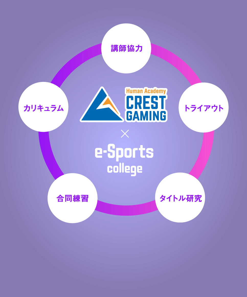 e-Sports業界で活躍できる人材を育成するために、 プロのトップチーム「Human Academy CREST GAMING」、 それを目指す下部組織「CREST GAMINGアカデミー」、ヒューマンアカデミー「e-Sportsカレッジ」、そしてヒューマ ンキャンパスのぞみ高等学校の「eスポーツ専攻」から構成される育成システムを整備しています。「e-Sports カレッジ」の学生は、在学中よりスカウト制度やトライアウトに参加することができ、合格すれば、トップ チームの下部組織である 「CREST GAMINGアカデミー」に所属することができます。プロチームを運営するヒューマンアカデミーだからこそできる育成システムにより、世界で戦えるプロを育成します。