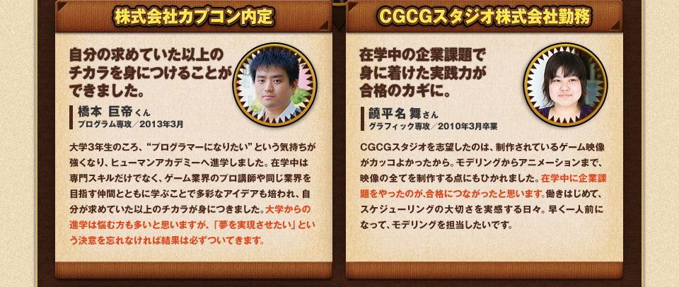 ゲームの企画・開発を手掛ける会社でCGデザイナーの仕事を体験しました。授業の内容ではできて当然なのがプロの仕事。自分の未熟さを実感しました。それでも、インターンシップ中には真剣に取り組み、「ここで働きたい!」という熱意をアピール。結果、内定をいただくことができ、夢がかないました。