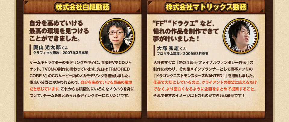 大学でCGに興味を持ったので、是非CGを使った映像業界の仕事に就きたいと思い、入学を決意しました。周囲の学生もやりたい仕事は人それぞれなので、お互い良い刺激になりました。 僕の場合は、授業で学んだことと、実際の仕事の担当が合致していたので、自然に仕事をこなすことができました。 これからも頑張って、一人前の映像作家を目指したいです。