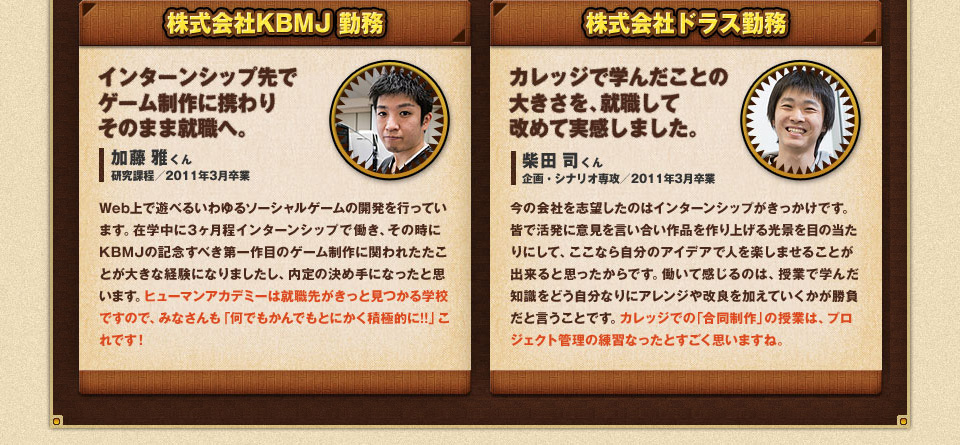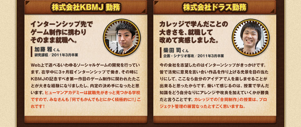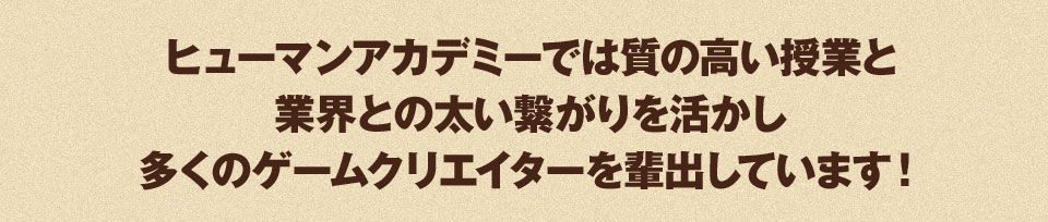 今の若い人は協調する能力は高いですが、際立った個性に欠けている気もします。少なくとも一度は自分の「はっちゃけた」個性を見せて、その個性を肯定してもらって自信をつける…という経験をしてほしいですね。そういう意味ではヒューマンさんのカリキュラムにある「チーム制作」の経験は有効なんです。自分の個性にあったポジションを早めに見つけられるといいですね。
