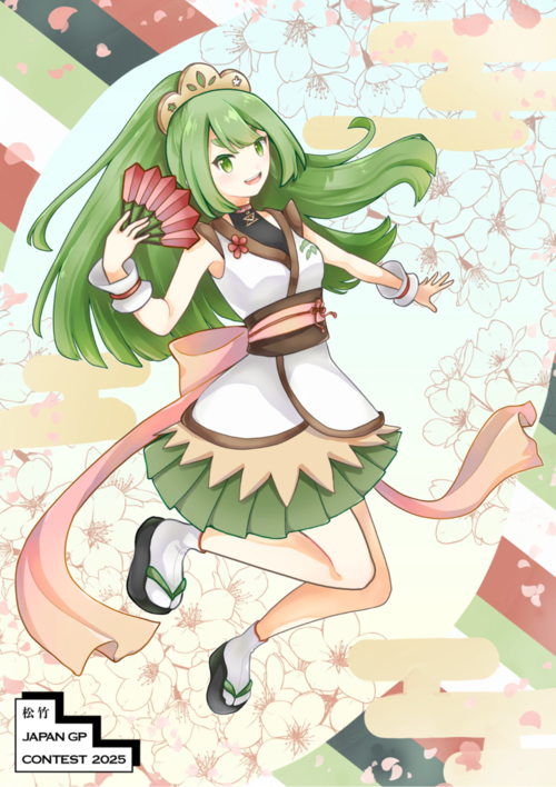 桜や和装、扇子などで日本らしさを表現し、緑髪の活発なキャラクターが若々しさと個性を際立たせています。