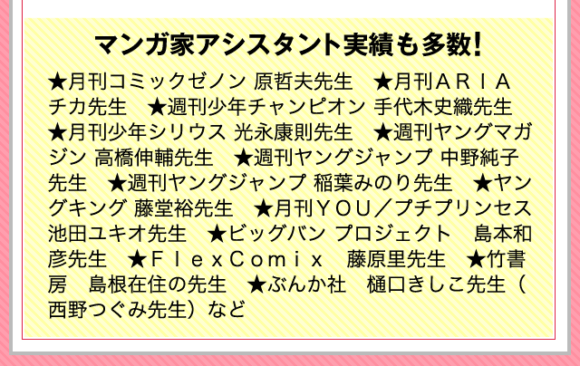 マンガ家やイラストレーターとして第一線で活躍する100人の現役プロが、少人数制クラスで弱点を補い長所を伸ばすための一人ひとりに合った指導を実施。